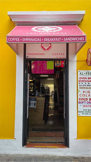 Nestled in Old San Juan, Al-FREDO is a charming spot celebrated for its authentic Puerto Rican empanadas, rich lattes, and hearty, homemade breakfasts. Our specialty empanadas include tasty varieties such as: Spinach & Feta Cheese, Ground Beef with Sweet Plantains, Chicken and more. We are proud to serve Cortaditos and Iced Coffee made with premium 100% Puerto Rican coffee. Our flavorful Piña Colada are a must-try. Despite being a cozy space, we offer a warm and friendly atmosphere, making us a favorite among locals and discerning visitors alike. Experience genuine flavors without the tourist crowds. Join us at Al-FREDO for a taste of Puerto Rico served with a smile.